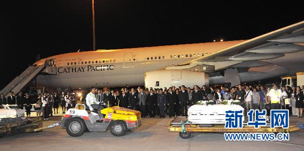 這是8月25日在香港機場拍攝的菲律賓人質事件遇難者迎接儀式。當日,搭載菲律賓人質事件8名遇難香港同胞遺體和部分傷員、旅行團成員及家屬的包機返抵香港,特區政府政務司司長唐英年、中央政府駐港聯絡辦副主任李剛、外交部駐港特派員公署特派員呂新華等到機場迎接。新華社記者黃曉勇攝