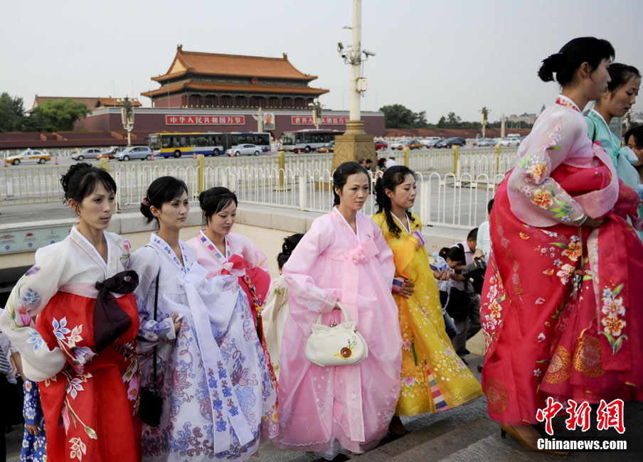 9月1日,朝鮮平壤藝術(shù)團的藝術(shù)家參觀天安門廣場。當(dāng)日,朝鮮平壤藝術(shù)團在中國全國的巡演活動正式啟動,平壤藝術(shù)團將在上海世博、寧波、廣州、深圳、珠海、昆明、重慶、武漢等20多個城市巡演“怒放的金達萊”。中新社記者 廖攀 攝