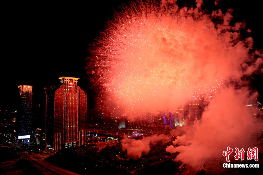 9月6日晚8點30分,深圳夜空璀璨絢麗,慶祝深圳經濟特區建立30周年焰火晚會在深南大道水晶島舉行。今晚燃放煙花數量145107發,主要品種19種,全長30分鐘,共四個樂章。深圳市民分別在蓮花山公園、市民中心、深南路、彩田路、會展中心等區域觀看深圳經濟特區30周年慶典煙花晚會。中新社記者 陳文 攝