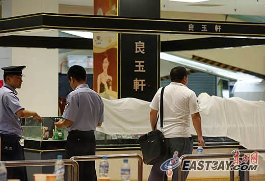警方人員在勘查現場。白布遮蓋的區域為遭劫柜臺。