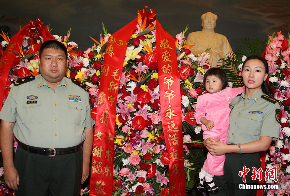 9月9日是毛澤東逝世34周年紀(jì)念日。當(dāng)日上午,毛澤東的孫子、剛剛晉升為解放軍少將的毛新宇與夫人劉濱,帶著兩歲的女兒毛甜懿到位于北京天安門廣場的毛主席紀(jì)念堂敬獻(xiàn)鮮花。中新社記者 任晨鳴 攝