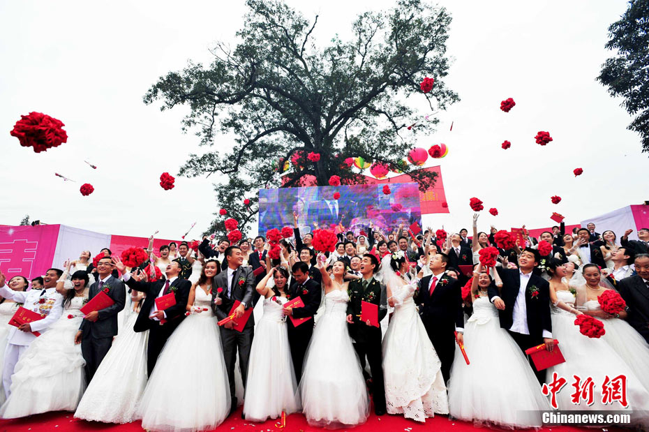 9月22日中秋佳節之際,99對參與過抗震救災及災后重建的新人,在四川省什邡市紅豆村的千年紅豆樹下,互許終身,共慶婚禮。圖為新人們在千年紅豆樹下見證愛情,同拋新娘捧花。中新社發 安源 攝