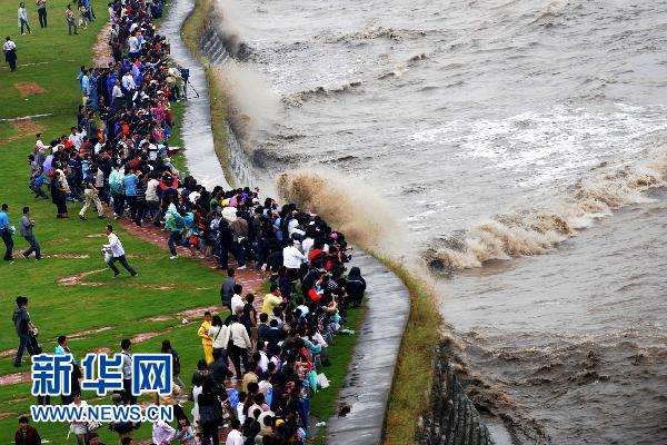 9月23日,游客在觀看錢塘江潮。當(dāng)日是秋分節(jié)氣,又值中秋假日,眾多游客來到浙江海寧市鹽官觀潮景區(qū)觀看錢塘江潮。錢塘江大潮號稱“天下第一潮”,中秋前后是觀看錢塘江潮的最佳時(shí)機(jī),每年都會吸引數(shù)十萬中外游客前來觀看。 新華社記者 韓傳號 攝