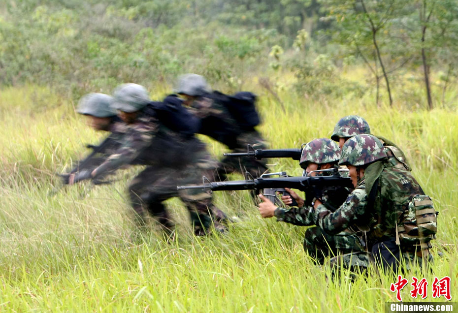10月11日,中國、泰國兩軍特種部隊“突擊—2010”反恐聯合訓練在廣西桂林開展混合班組掩護實彈射擊訓練。此次聯訓為期15天,這是中泰兩國陸軍首次就城市反恐課題開展聯訓。中新社發 杜洋 攝