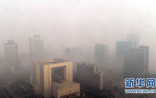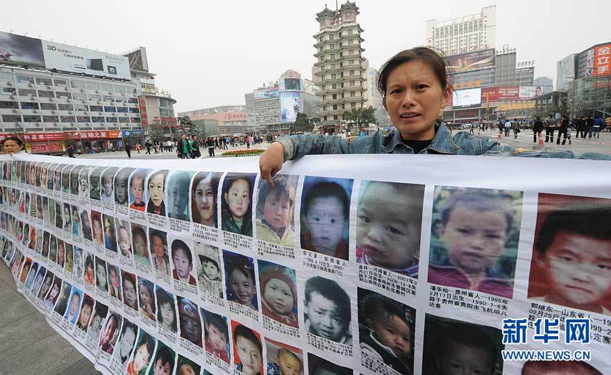 10月12日,一名失蹤兒童的母親在鄭州二七廣場指著條幅上自己孩子的照片。