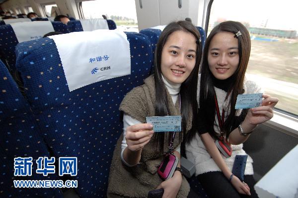 10月26日,在上海至杭州的高鐵動車組列車上,一對來自上海的雙胞胎在展示購買的車票。當日,連接上海、杭州兩個城市的滬杭高鐵正式開通。記者登上滬杭高鐵動車組列車,感受全新的旅程。 新華社記者 鞠煥宗 攝