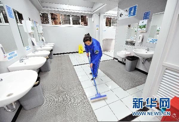 世博之美,美在大氣磅礴,亦美在細致入微;人們沉醉世博,難舍世博,難忘世博,不僅因為這里集人類文化與科技精華之大成,也因為這里匯聚了無數充滿溫情與智慧的細節。這是人類歷史上壯麗的一幅卷軸,也是一張我們從未有過的考卷,讓我們銘記:細節記錄精彩,細節疊加滿意,細節決定成敗。保潔員朱定碧在清掃世博園里的廁所(5月21日攝)。 新華社記者何俊昌攝