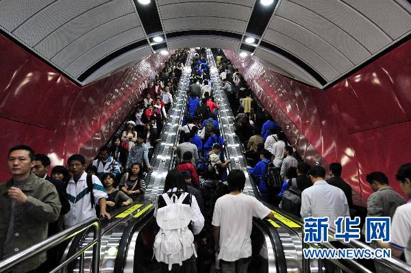 為了方便亞運會期間市民出行,從11月1日起至12月21日,除節假日外,廣州全市所有公交、地鐵免費搭乘,時間長達30天。同時,廣州從11月1日起至12月21日開始實行單雙號限行。據廣州地鐵總公司統計的數據,從11月1日開始,廣州地鐵日均客流量翻番。11月1日總客流量達到了780萬人次,比免費政策實施前的日均客流量翻了一倍,2日到4日的日均客流量超過了650萬人次。為應對地鐵客流猛增,廣州地鐵總公司采取了一系列措施。第一,客流高峰時段,采取限制客流的方式,實行乘客分批次進站,保障地鐵內部有相對寬敞的空間。第二,采取飛站(經過客流聚集較大的站時不停車)、清客(在經過某些客流聚集較大的站之前將列車清空)等措施緩解地鐵樞紐站的客流。第三,增加了志愿者、保安、公安共3000多人參與維持地鐵秩序。此外,廣州地鐵總公司呼吁群眾理性出行,在選擇地鐵出行時,盡量避開上下班高峰期。乘坐地鐵盡量不要選擇在人流聚集較多的地鐵樞紐站下車。新華社記者 陳曄華攝