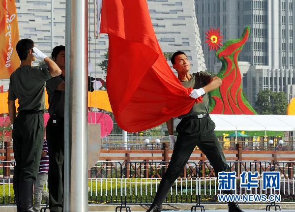 廣州亞運會開幕在即,在開幕式上擔任護旗、升旗的中國人民解放軍陸海空三軍儀仗隊隊員們正在做最后的演練,以確保12日晚開幕式上圓滿完成任務。新華社記者 王頌 攝