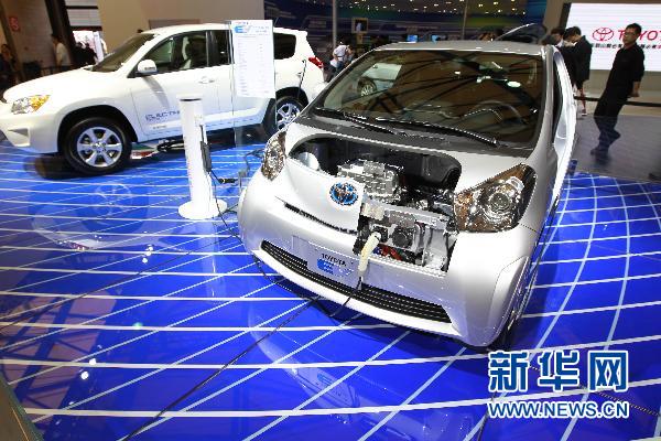 這是在車展上亮相的使用家用電源充電的豐田電動車(4月20日攝)。 4月21日,第十四屆上海車展將正式向公眾開放,本屆車展成了海內外車企比拼新能源技術的舞臺,共有86輛新能源汽車登臺亮相,數量創歷屆之最。除傳統純電動技術、油電混合動力技術外,燃料電池汽車、超級電容汽車等也將在本屆車展上與觀眾近距離接觸。新華社記者 裴鑫 攝