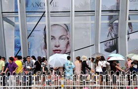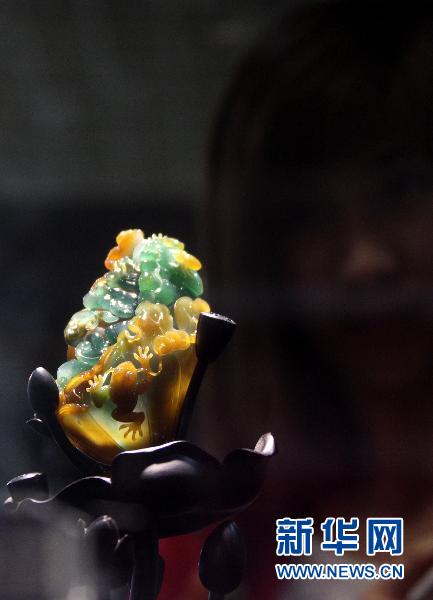 4月30日,參觀者在觀看展品《三彩夏韻》。當(dāng)日,第三屆“珍世奇葩——翡翠精品展”在北京潘家園現(xiàn)代收藏品大廳開展,共展出200余件A貨翡翠精品雕件(組)。 新華社記者汪永基攝