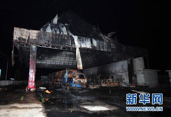這是6月14日拍攝的爆炸事故現(xiàn)場。 6月14日18時30分左右,在廣西賓陽縣黎塘鎮(zhèn)永安西路新埠橋收費站旁的港興停車場(原為廢棄加油站,現(xiàn)為車輛臨時停放點),一輛裝載氯酸鉀、碳粉等易燃易爆物品的貨車,因卸貨不慎引發(fā)爆炸,并引起停車場內(nèi)20輛汽車發(fā)生燃燒。經(jīng)初步核實,已造成8人死亡、2人重傷、4人輕傷。新華社記者 黃孝邦 攝