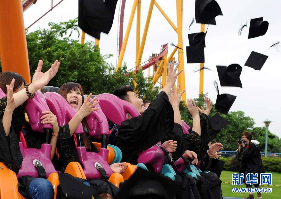 6月22日,大學(xué)畢業(yè)生們身穿學(xué)士服在廣州長隆歡樂世界超級大擺錘上挑戰(zhàn)“不一樣的畢業(yè)禮”。當(dāng)日,來自中山大學(xué)、暨南大學(xué)等高校的百名應(yīng)屆畢業(yè)生在一場主題為“贏取未來”的畢業(yè)典禮上,以挑戰(zhàn)刺激的游戲項目來提升闖蕩職場的勇氣。新華社記者 劉大偉 攝