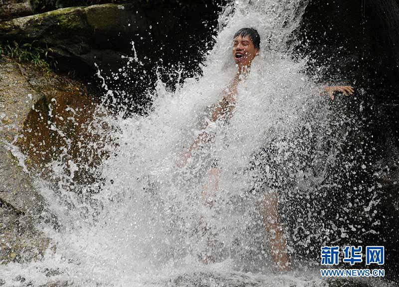 7月8日,在廣西十萬大山森林公園,一名游客在享受“瀑布按摩”。近日,廣西各地氣溫迅速攀升,多地發(fā)布高溫橙色預(yù)警信號。在酷暑天氣的推動下,到各景區(qū)“納涼游”的游客明顯增多。 新華社發(fā)(梁富盈 攝)