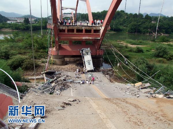 福建省武夷山市委提供的最新消息,當日上午8點50分左右,武夷山市的武夷山公館大橋北端發生垮塌,一輛旅游大巴車墜入橋下,當場造成1人死亡,22人受傷,受傷人員已全部送往當地醫院救治這是7月14日拍攝的事故現場。 新華社記者沈汝發攝