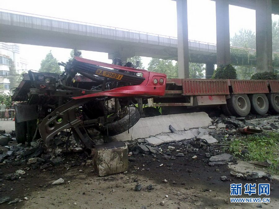 7月15日凌晨,杭州錢江三橋輔橋主橋面右側車道部分橋面突然塌落,一輛重型半掛車從橋面墜落,又將下閘道砸塌。司機跳車受傷,送往醫(yī)院救治。新華社記者 陸志艮攝