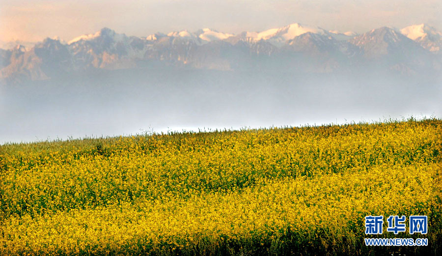 新疆昭蘇:百萬畝油菜花似金色海洋 昭蘇縣的油菜花海與天山雪山遙相輝映(7月14日攝)。七月的新疆昭蘇縣,無邊的油菜花猶如金色的織毯,伸展在無垠的昭蘇大草原,與天山遙相輝映,讓游客在盛夏時節感受到花海的壯美。位于中哈邊境地區的昭蘇草原,是中亞內陸腹地的一個高位山間盆地,冬長無夏,春秋相連,是新疆最大的春油菜產區,每年種植面積90至110萬畝,占全疆油菜種植面積的40% 左右。當地群眾形容這里的油菜花是“從身邊連到山邊,從山邊連到天邊”。 新華社記者 陶明 攝