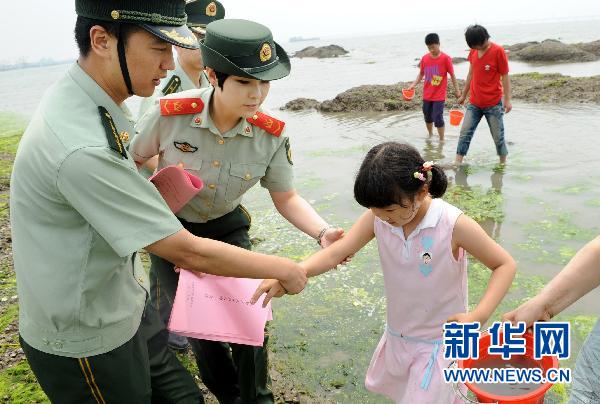 7月15日,紅島邊防派出所民警在漲潮前提醒游客上岸。隨著旅游旺季的到來,越來越多的外地游客來青島看海,因不懂大海潮汐規(guī)律時有游客被困礁石的險情發(fā)生。為此,當(dāng)?shù)剡叿烂窬闪⒘藨?yīng)急救助分隊,加強(qiáng)海岸巡邏力度,提醒游客注意安全。新華社記者 李紫恒 攝