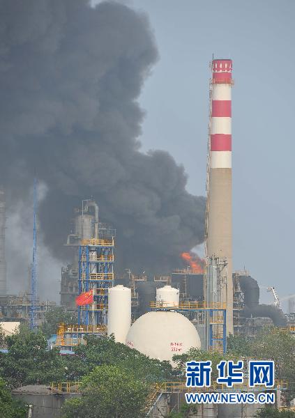 7月16日下午,中石油大連石化分公司起火現場。當日14時30分許,中石油大連石化分公司一煉油裝置發生泄漏起火。目前救援人員正在撲救大火。 新華社發(劉德斌 攝)