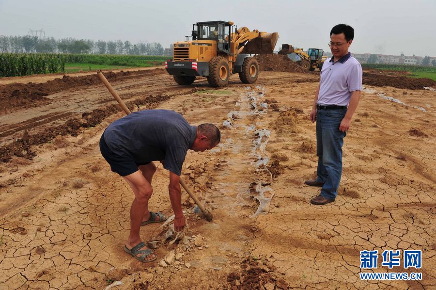 在湖北省襄陽市襄州區雙溝工業園9號路上,雙溝鎮吳河村村民吳小先向記者展示沒有搬走的泥土里的薄膜(7月15日攝)。近年來,在全國土地執法檢查中,衛星遙感圖片監控猶如“天眼”,使違法違規用地難以藏身。然而最近,湖北襄陽市雙溝工業園卻別出心裁,在建好的水泥路上“填土種菜”,在“天眼”底下玩了一回“隱身”,被當地老百姓舉報。“新華視點”記者進行了實地調查。新華社記者 杜華舉 攝