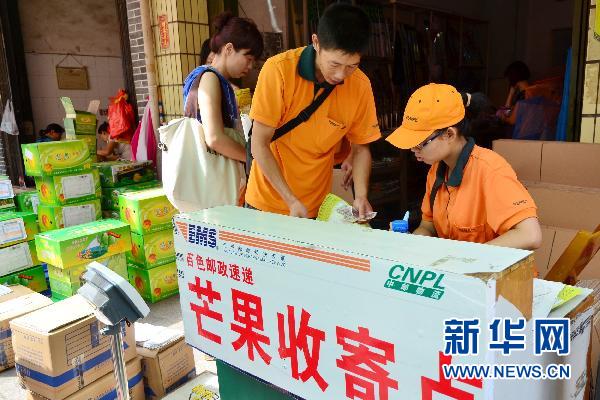7月23日,在廣西百色市右江區芒果銷售市場百色郵政速遞芒果收寄點,投遞員為客戶辦理芒果寄遞件。 7月以來,在全國最大芒果基地之一的廣西百色市右江河谷芒果基地,品質優良的百色芒果陸續成熟上市。當地多家物流公司紛紛在芒果銷售現場設立芒果寄遞服務點,每天投遞的芒果上萬件,寄往全國各地。 新華社發(韋萬忠 攝)
