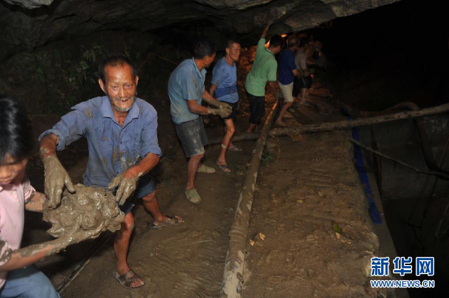 8月2日,在貴州石阡縣花橋鎮北坪村,當地的黨員自發組織“黨員抗旱救災突擊隊”,對一處有水源的涵洞進行清淤,準備利用涵洞蓄水,開展生產自救。新華社記者 歐東衢 攝