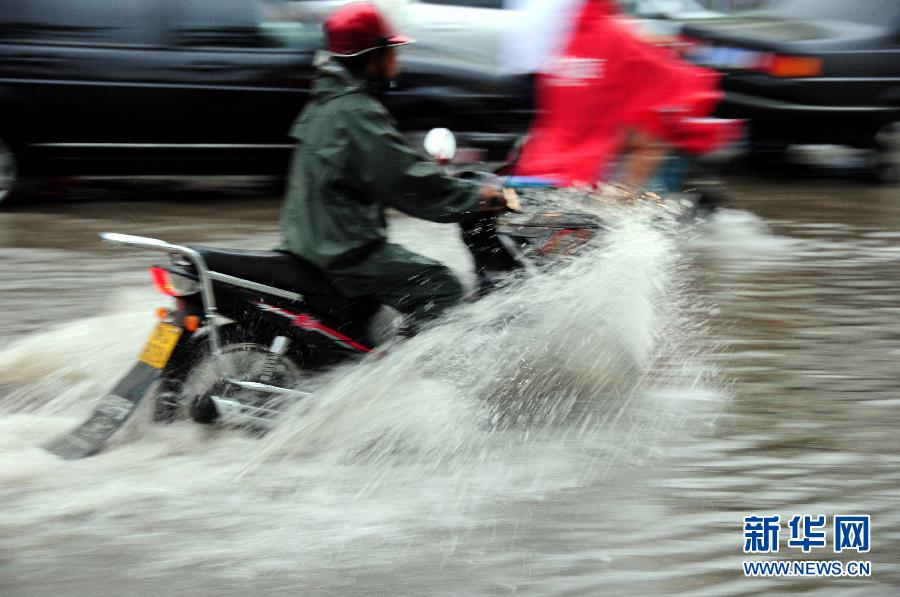 8月11日,市民在山東省臨沂市郯城縣街頭涉水騎行。 當日,山東大部突降暴雨,造成多個城市嚴重積水,產生短時內澇。據山東省氣象臺預報,未來三天,部分地區仍有較強降雨。 新華社發(房德華 攝)
