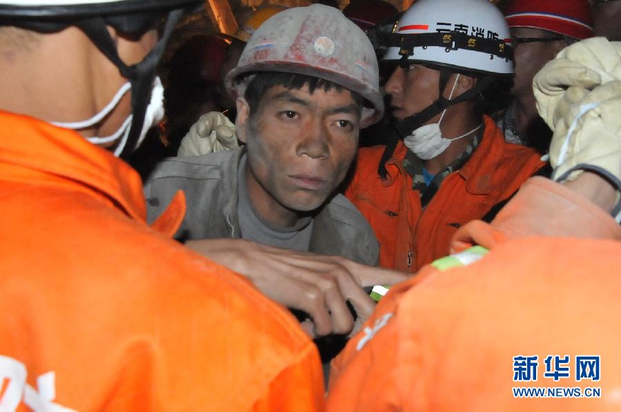 8月12日晚23時50分左右,被困于迪慶一在建公路坍塌隧道內的8名人員被安全救出。經醫務人員初診,獲救人員除極度疲勞外,生命體征均正常。8月11日6時左右,在建的國道214線香格里拉至德欽二級公路白馬雪山3號隧道突然發生坍塌,致使正在里面施工的8名工人被困。新華社發(石顯堯 攝)