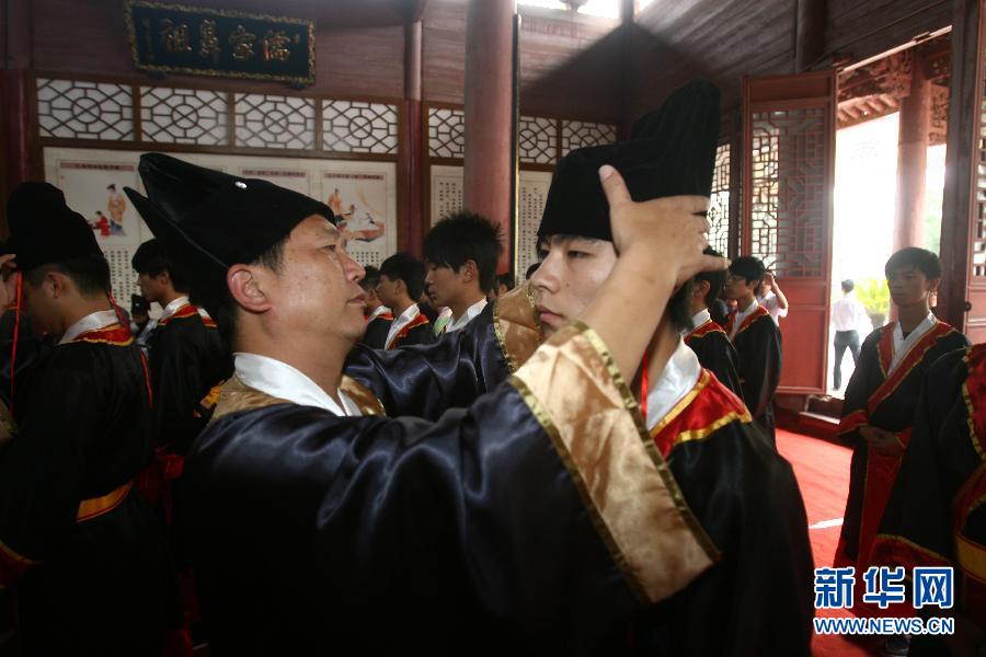 新華社照片,寧波(浙江),2011年9月21日 兩岸青年浙江奉化共行成人禮 9月21日,在浙江省奉化市孔圣殿,正賓(左)為青年代表加冠。 當日,“同根同源共享成長”2011兩岸青年成人禮在浙江省奉化市孔圣殿舉行,來自兩岸的56名優秀青年代表通過共同參加傳統成人儀式,升華對中華傳統文化的認知,感受中華文化的一脈相承、共融互通。新華社發(張培堅 攝)