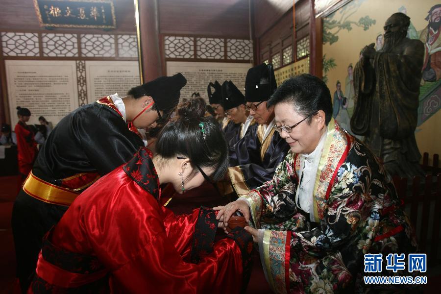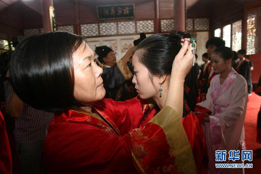 新華社照片,寧波(浙江),2011年9月21日 兩岸青年浙江奉化共行成人禮 9月21日,在浙江省奉化市孔圣殿,正賓(左)為青年代表加笄。 當日,“同根同源共享成長”2011兩岸青年成人禮在浙江省奉化市孔圣殿舉行,來自兩岸的56名優秀青年代表通過共同參加傳統成人儀式,升華對中華傳統文化的認知,感受中華文化的一脈相承、共融互通。新華社發(張培堅 攝)