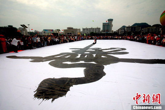 9月24日,書法家秦勝國在廣西桂林市甲天下廣場進行書法大字表演。秦勝國用拼接的宣紙現場寫出一個長50米、寬20米的巨型“舞”字,讓市民感受了書法藝術的獨特魅力。