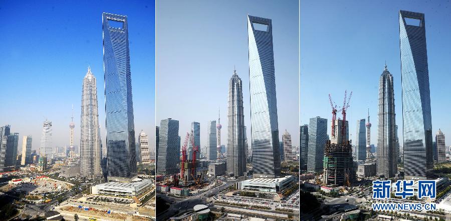 左圖:2008年11月29日拍攝的正式開工建設(shè)的上海中心大廈;中圖:2011年2月23日拍攝的建設(shè)到10層高度的上海中心大廈;右圖:2011年10月9日拍攝的開始35層以上施工的上海中心大廈(拼版照片)。近日,在建“中國第一高樓”上海中心大廈主樓核心筒開始35層以上高度建設(shè),主樓高度即將突破200米。10月10日,上海中心大廈將進(jìn)行地下爆破拆除施工,地下5層開始進(jìn)入最后施工階段。新華社發(fā)(鈕一新 攝)