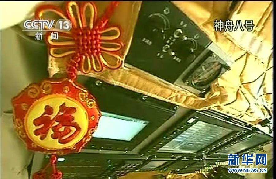 11月1日,神舟八號飛船在酒泉衛星發射中心升空。這是飛船內的中國結。新華社發(視頻截圖)
