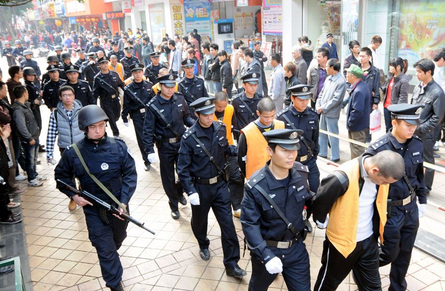 12月15日,南寧警方將近日抓獲的數十名“公交扒手”武裝押解到鬧市區集中指認現場,引來許多現場圍觀群眾。