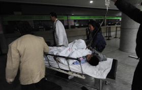 12月22日,在寧夏回族自治區石嘴山市黃河大橋下,一名群眾在向記者展示流凌冰塊的厚度。