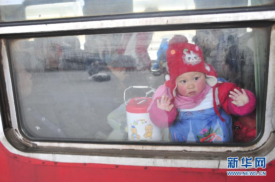 1月9日,2012年春運第一天,在浙江寧波火車東站一列即將開往阜陽的列車上,一名孩子向窗外張望。 春運,像一場大戰。在這個千軍萬馬的洪流中,經常可以看到一些弱小的身影,他們隨著父母來來往往,奔波在城市和鄉村間,臉上有笑容,也有茫然。他們的父母為了生計,四處忙碌,他們也像候鳥,跟著遷徙。 新華社發(高遠 攝)