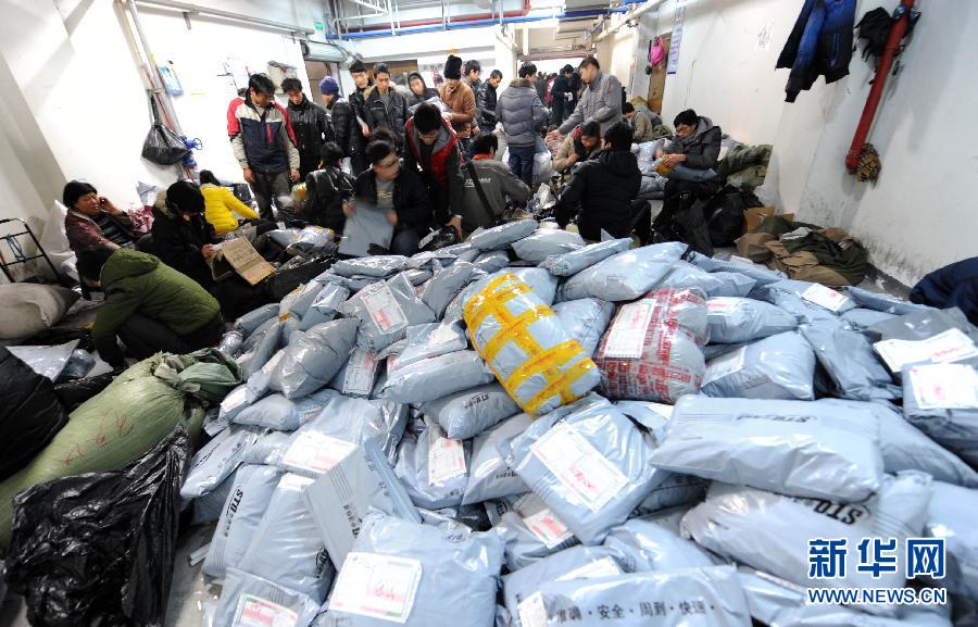 1月10日,眾多網店店主在杭州網店密集的四季星座大廈地下車庫內交寄快件。新華社記者 韓傳號 攝
