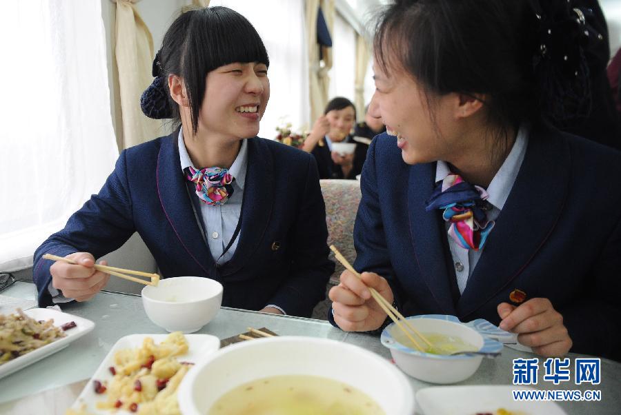16時(shí)左右,在工作間隙,楊茜與其他乘務(wù)員列隊(duì)來(lái)到餐車吃午飯。之后,開始接下來(lái)的工作…… 這只是楊茜日常工作的一個(gè)片段。楊茜所在的班組每趟車跑下來(lái)要60個(gè)小時(shí)。“每次下班后從列車上下來(lái),腳踩在地上感覺(jué)都是飄的。”楊茜說(shuō)。 “春運(yùn)開始后,明顯感覺(jué)人多了,這對(duì)我們的服務(wù)提出了更高的要求。我們不僅要像平時(shí)一樣做好服務(wù)工作,還要更細(xì)致。”楊茜向記者談起自己的春運(yùn)感受。新華社記者李健攝