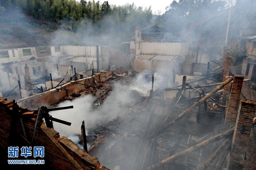 1月16日,福建省建甌市迪口鎮上店自然村被燒毀的民房冒著余煙。