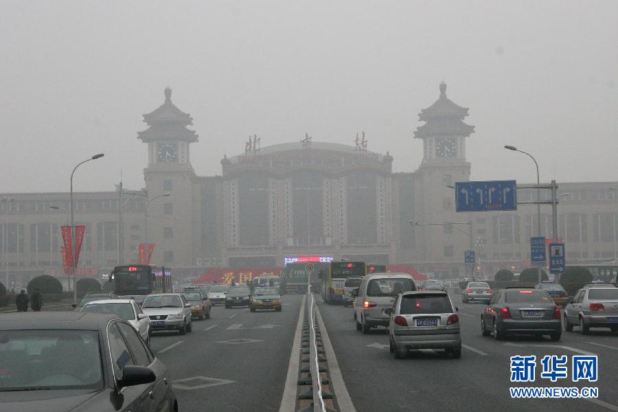 1月18日,北京火車站籠罩在大霧中。當日,北京出現大霧天氣,北京市氣象臺7時55分發布大霧黃色預警信號。 新華網社發