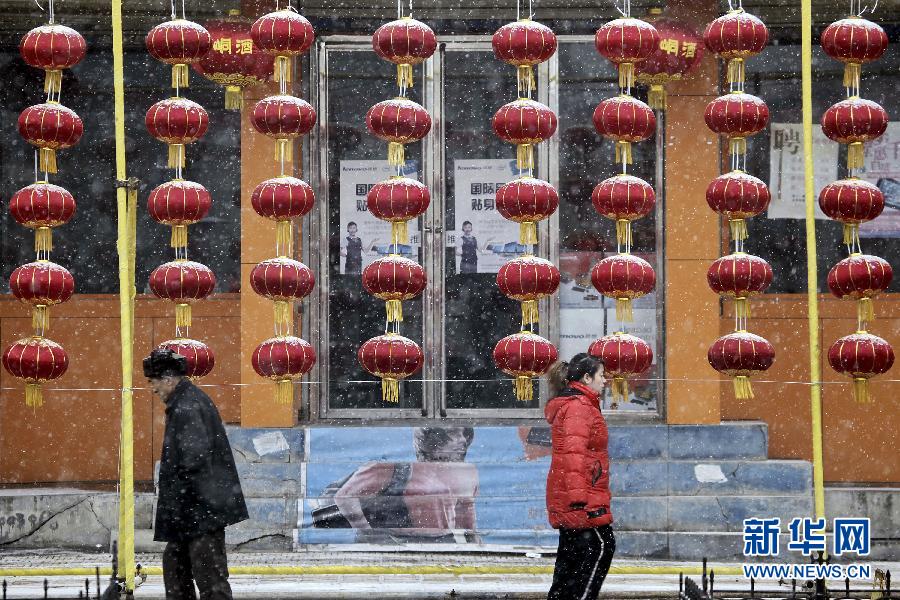 1月19日,甘肅平涼市民從人民廣場的紅燈籠下走過。 當日,甘肅省平涼市喜迎冬雪,街頭串串紅燈籠在白雪的映襯下格外亮麗,增添了濃濃的節日氣氛。 新華社發(楊昕 攝)