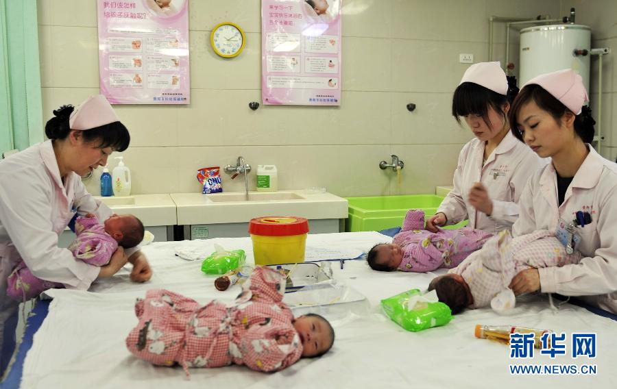 1月23日,貴陽婦幼保健院的護士在護理新生的龍年寶寶。 龍年伊始,各地醫院出現“龍寶寶”扎堆降生鬧新春的景象。據了解,選擇在龍年生寶寶的產婦比往年有所增加。 新華社發(彭年 攝)