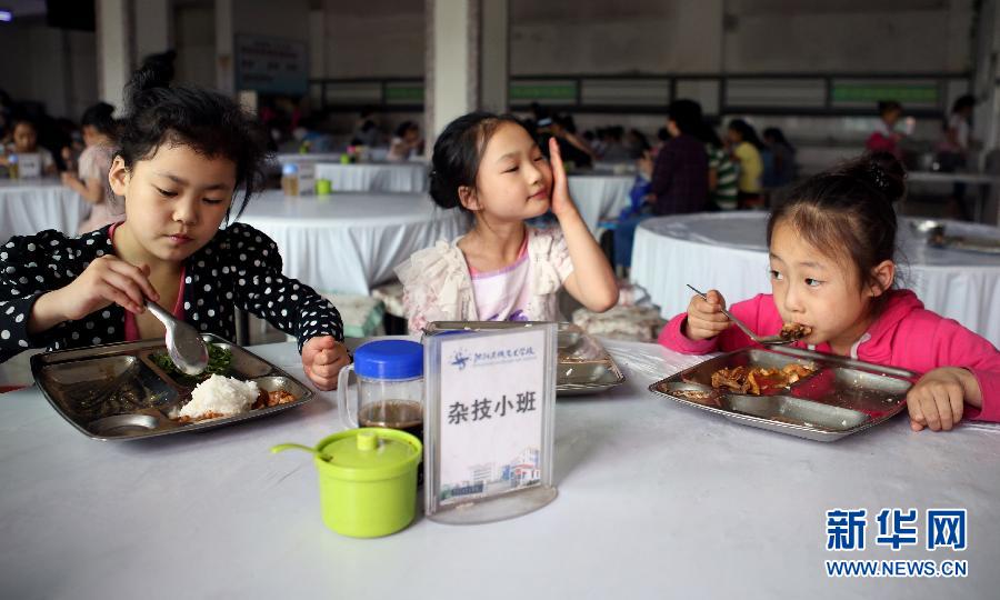 5月30日,8歲的李夢(mèng)鋅(左)、9歲的趙悅(中)和8歲的陸暢(右)在吃午飯。