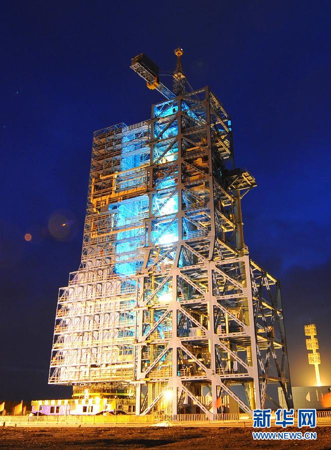 矗立在夜色中的神九發射塔架(6月13日攝)。西北大漠戈壁灘上的東風航天城,寧靜被打破,中國乃至世界的目光聚焦于酒泉衛星發射中心一處湖藍色的發射塔架。塔架內是神舟九號載人飛船和長征二F遙九火箭組合體,它們正等待3名中國航天員的“登機”,然后一起飛往太空,與天宮一號目標飛行器進行交會對接。這是繼去年11月無人乘坐的神舟八號飛船與天宮一號進行自動交會對接后,中國首次實施由航天員來完成的手動空間交會對接任務,將為2020年前后建造空間站奠定基礎。新華社記者李剛攝
