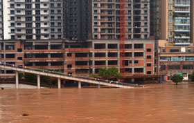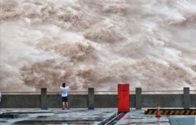 7月7日,三峽大壩開啟4個泄洪深孔泄洪。當日,形成于長江上游的2012年“1號洪峰”抵達三峽水域,流量高達每秒5.6萬立方米,創今年汛期來水新高。洪峰到來時,三峽樞紐積極攔蓄洪水,水庫水位漲幅明顯,7日上午漲至151米以上,高出防洪限制水位6米,創今年汛期水位新高。新華社發(鄭家裕 攝)