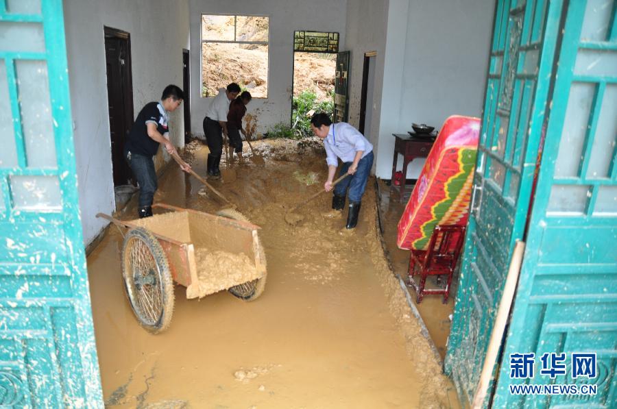 7月9日,在陜西省寧強(qiáng)縣舒家壩鎮(zhèn)珠觀村,鎮(zhèn)干部和村民一起清理一戶人家屋內(nèi)的淤泥。7月8日晚至9日,陜西省漢中市寧強(qiáng)縣遭遇強(qiáng)降雨,多個(gè)鄉(xiāng)鎮(zhèn)降雨量超過(guò)100毫米。暴雨導(dǎo)致近百戶房屋不同程度損毀,部分地區(qū)出現(xiàn)塌方和電力通信中斷等災(zāi)情。 新華社發(fā)(黎德華 攝)