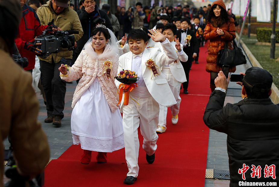 12月1日,因皮影結緣的7對“袖珍人”,在北京一同走進婚姻的殿堂。這14位新人均來自龍在天皮影劇團,他們身高最高的僅為1.38米,最矮的則是1.24米,年齡從21歲到27歲不等。中新社發 富田 攝