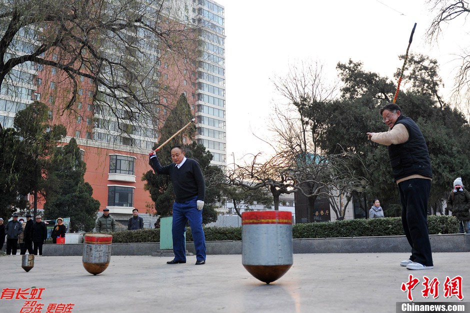 12月7日,在河北省兒童活動中心廣場,60歲的王志根老人舉手揮鞭抽動著一個重達56斤的陀螺。