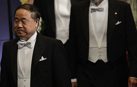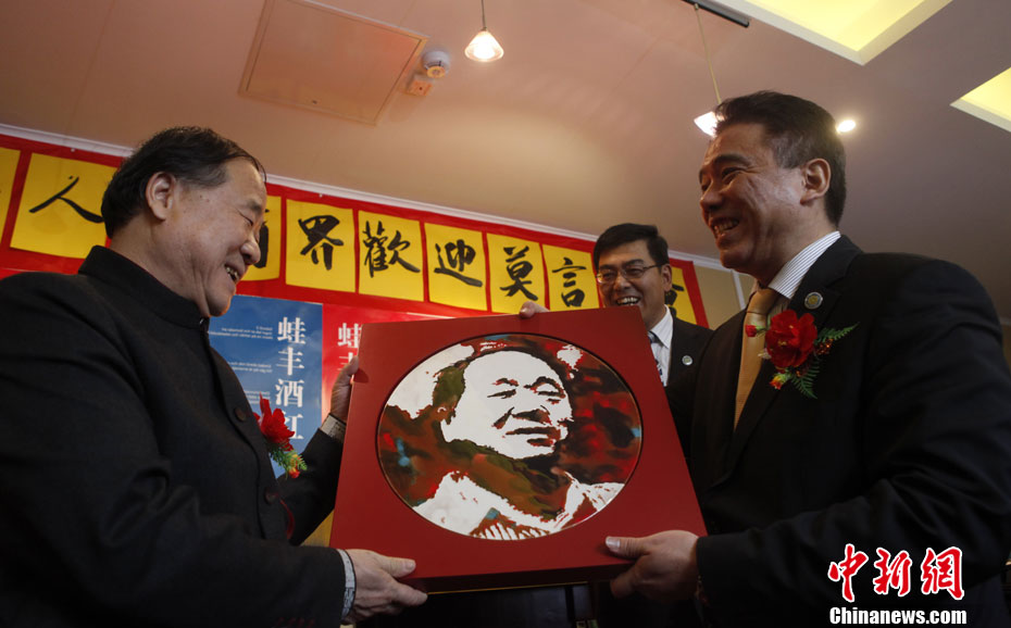 12月8日中午,2012年諾貝爾文學獎得主莫言在諾貝爾故居與瑞典華人華僑相聚一堂。據當地僑領介紹,位于斯德哥爾摩近郊的百樂門賓館曾經是諾貝爾故居。在當天的歡迎宴會上,當地華僑向莫言贈送禮物,莫言高興地看著自己的畫像。中新社發 沈晨 攝