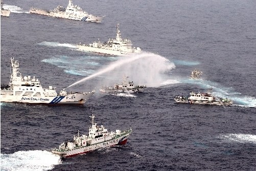 日本《朝日新聞》,北京時間10時45分,日本海上保安廳8艘巡視船對保釣船“全家福”號和護送該船的臺灣“海巡署”巡邏船展開水炮攻擊。從照片上可見,臺灣巡邏船也使用水炮對日本船只進行回擊。